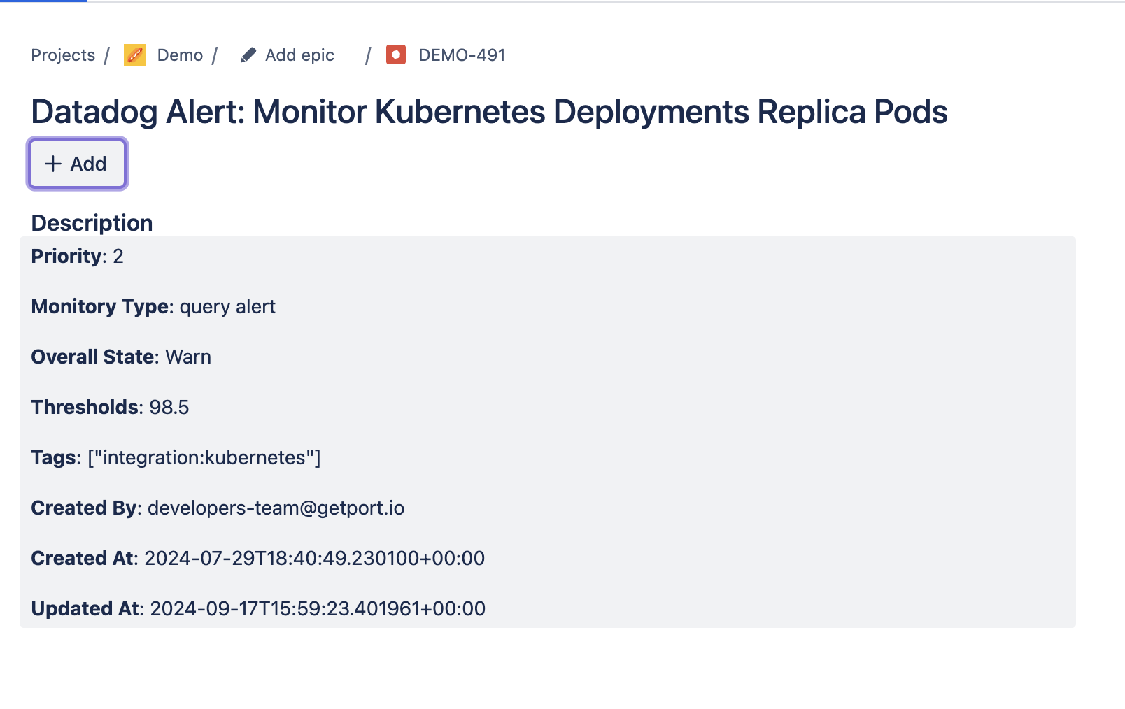 "description": "Automation to open a Jira issue when a Datadog alert changes from medium to higher priority",